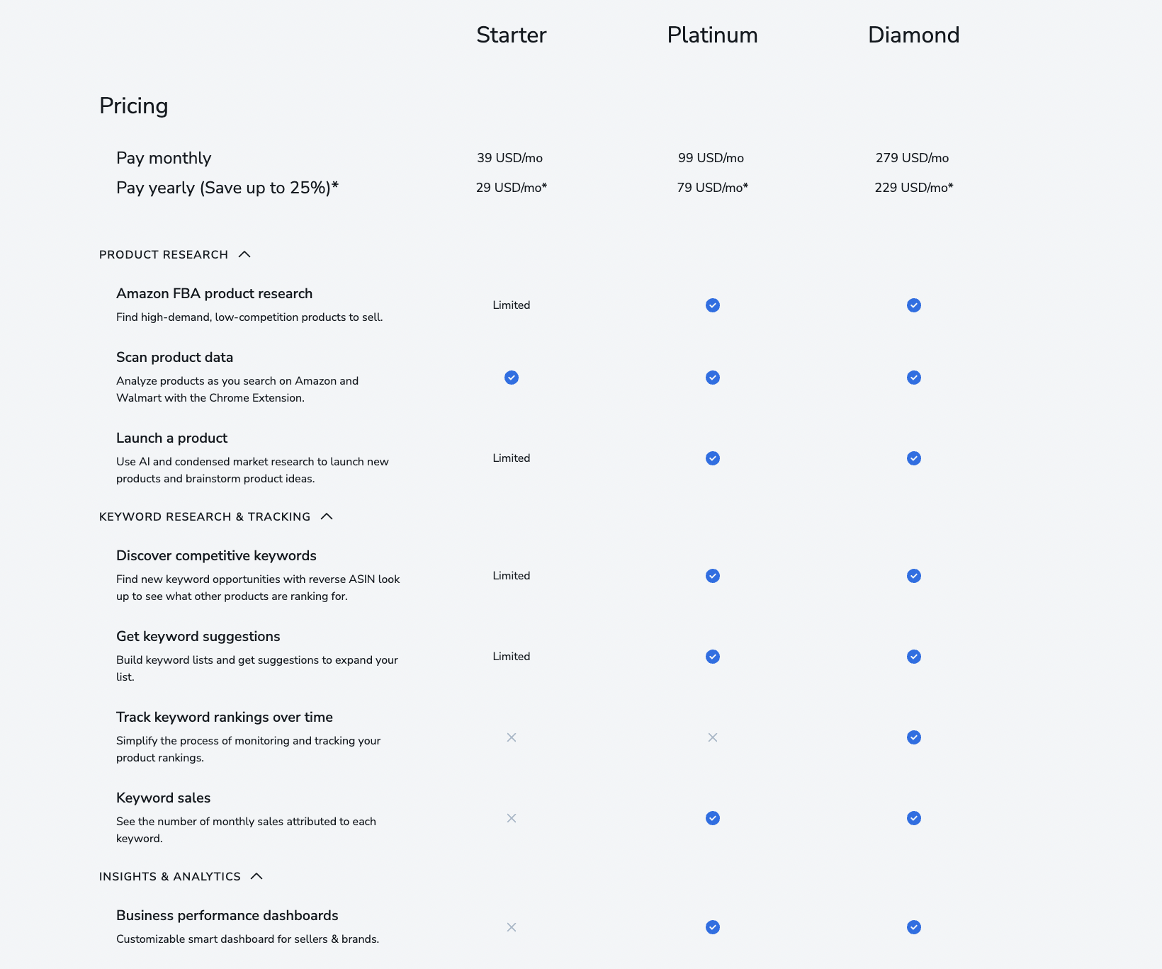 As you move up plans, you do not just unlock more tools. You also increase how often you can use them, how much data you can pull, and how many products or keywords you can track.