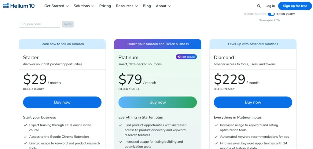 Helium 10 offers discounts for annual billing.