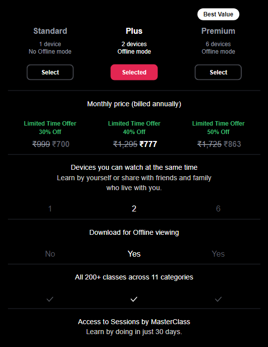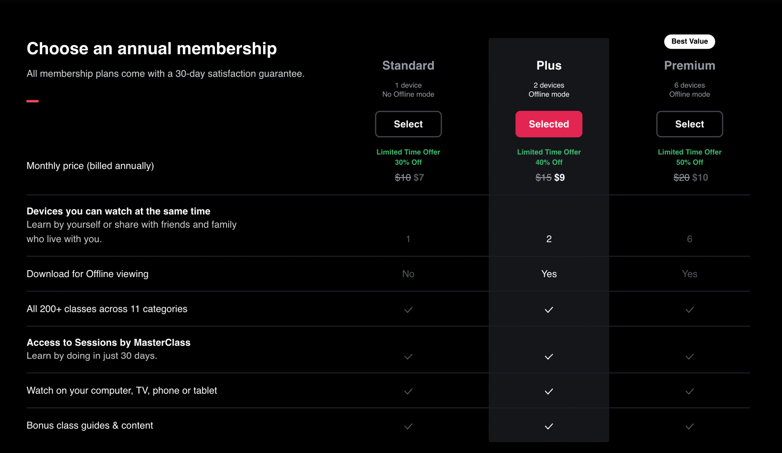 Upgrade to the Masterclass Plus Plan for only $9/month and gain access to exclusive content from world-renowned instructors.